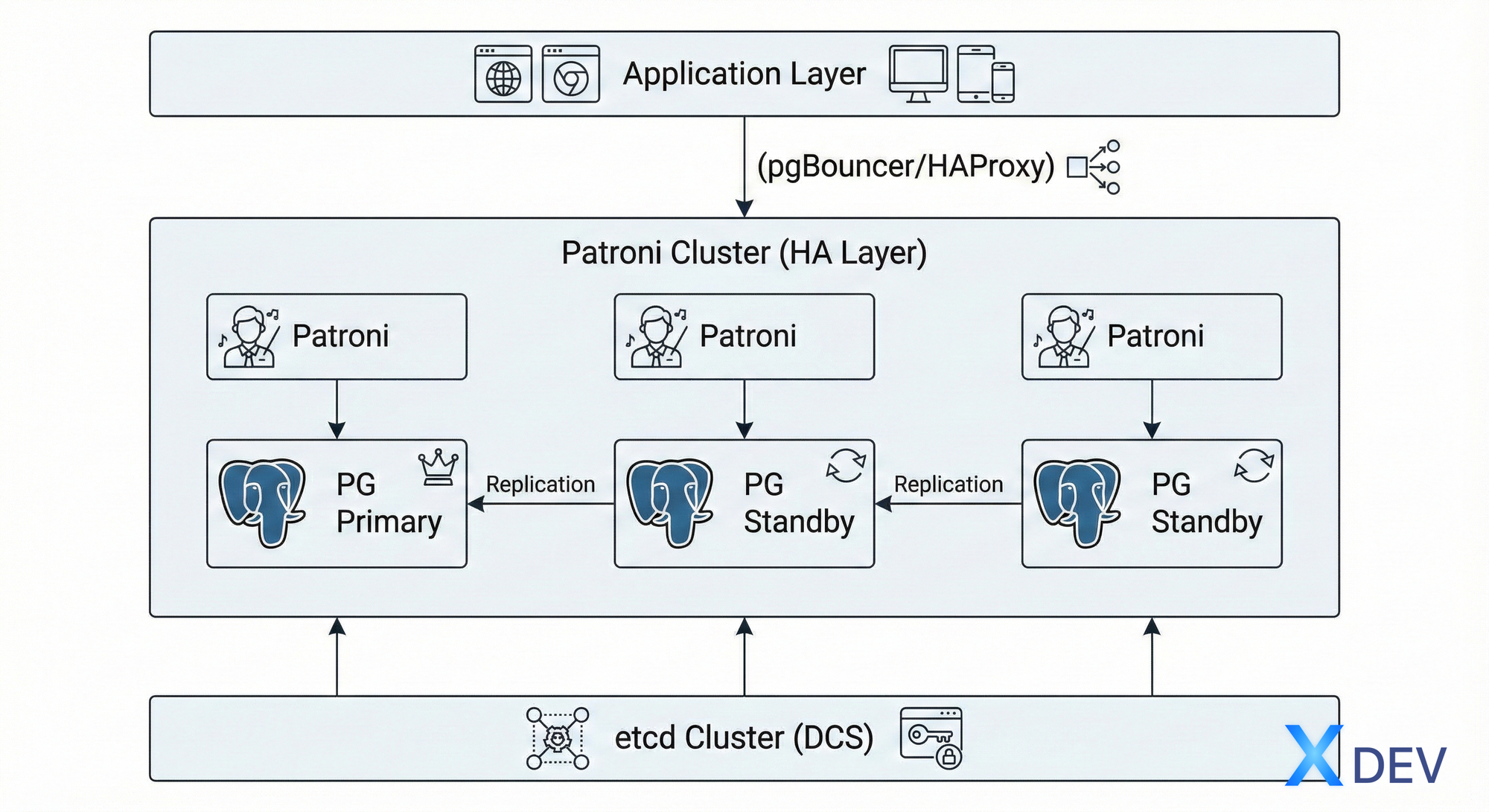 ✅ DCS (etcd): Distributed coordination, store configuration và leader lock